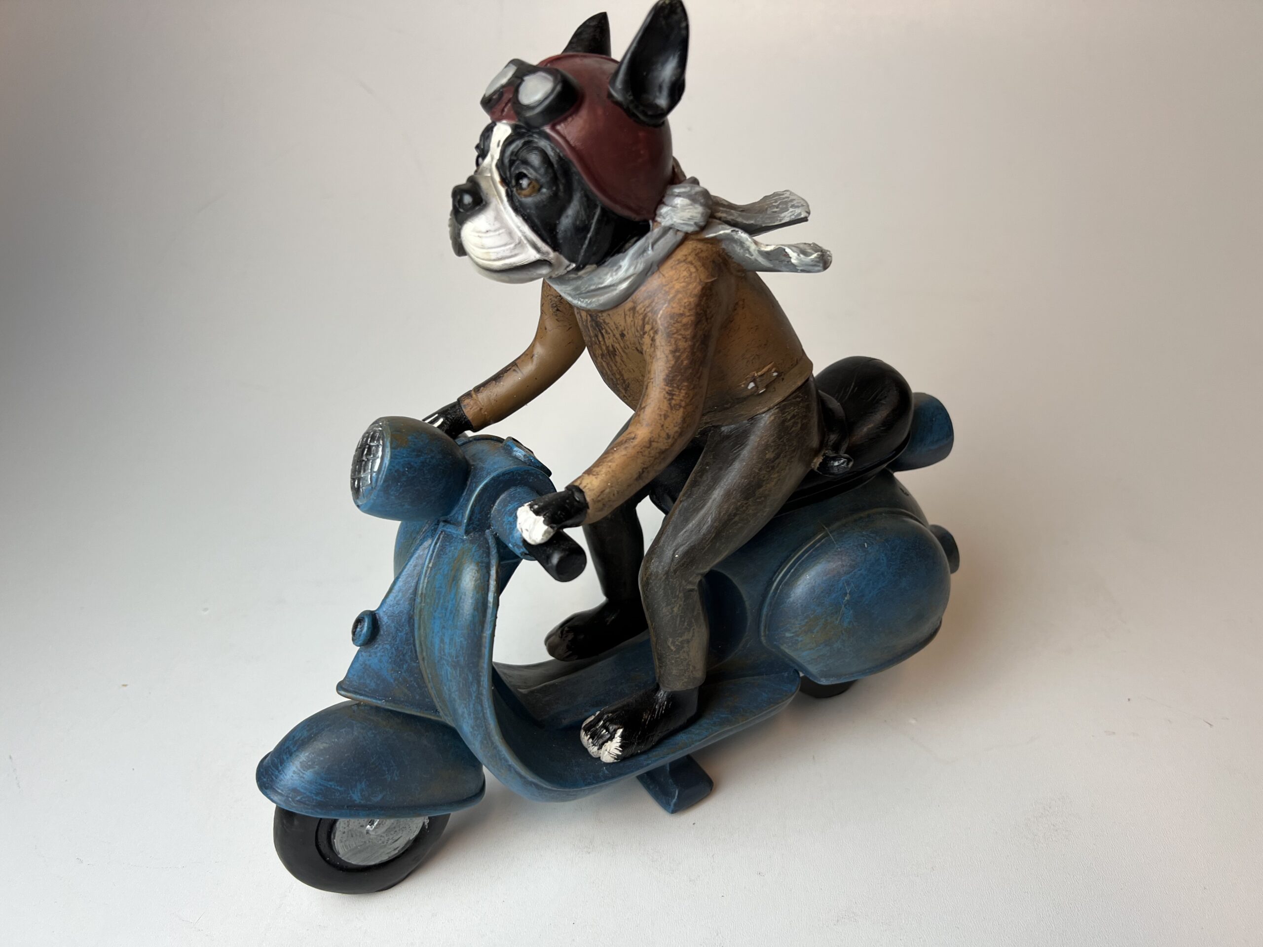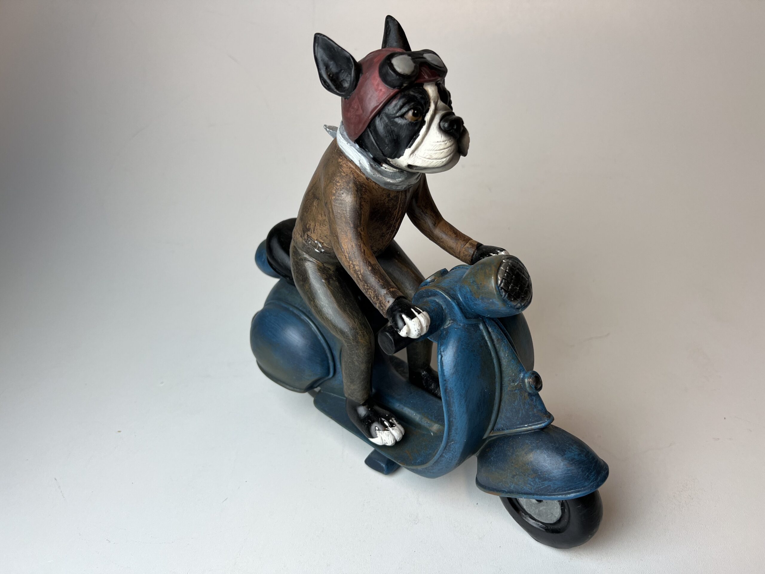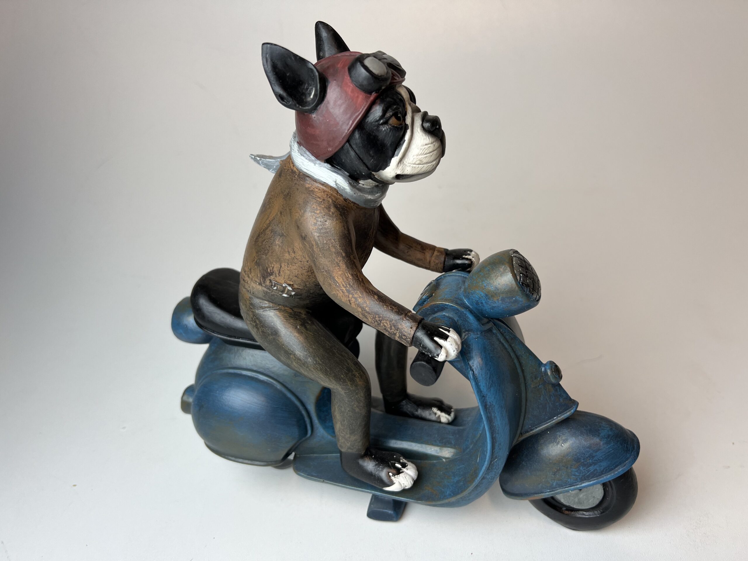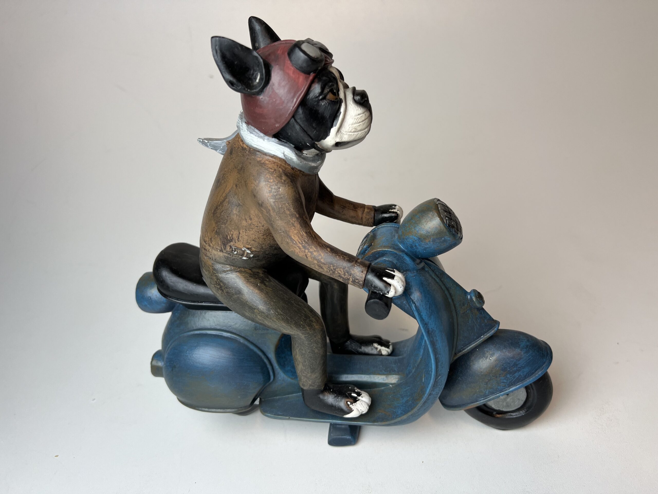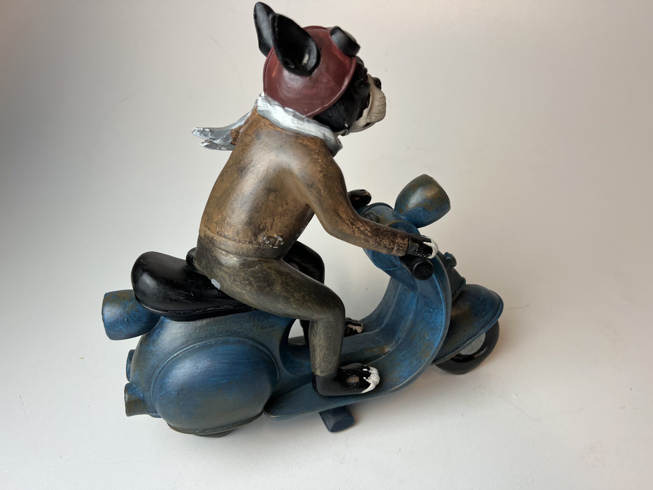 Deze stoere hond vind het heerlijk om een toertje te maken op de Vespa…. Haren in de wind en gaan. Een tof object voor de verzamelaar van unieke items! Het beeld is gemaakt van een harde soort kunststof, ook wel resin genoemd.