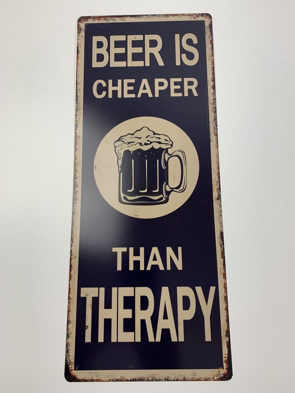 Metalen wandbord”beer is cheaper than therapy”Afmeting: 20 x 0,10 x 50 cm?Dit stoere bier bord is uitermate geschikt voor in de mancave, caf? of in een stoere inrichting! Ook leuk om buiten te hangen onder de overkapping.