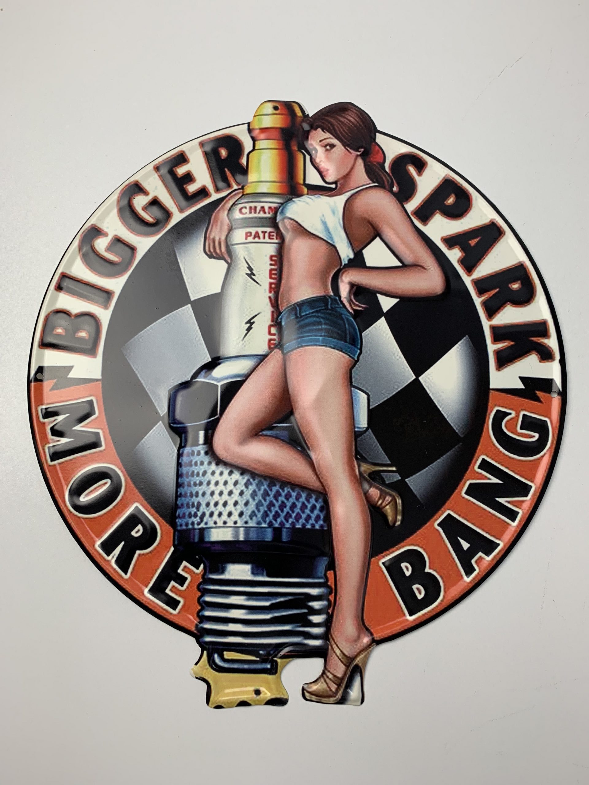 Metalen wandbord”bigger spark, more bang”Afmeting: 34,5 x 0,5 x 39 cmDit stoere metalen wandbord is perfect om jouw werkplek/mancave/chillplek op te leuken! Hij is redelijk groot van formaat, dus heel veel mooie dame om naar te kijken……