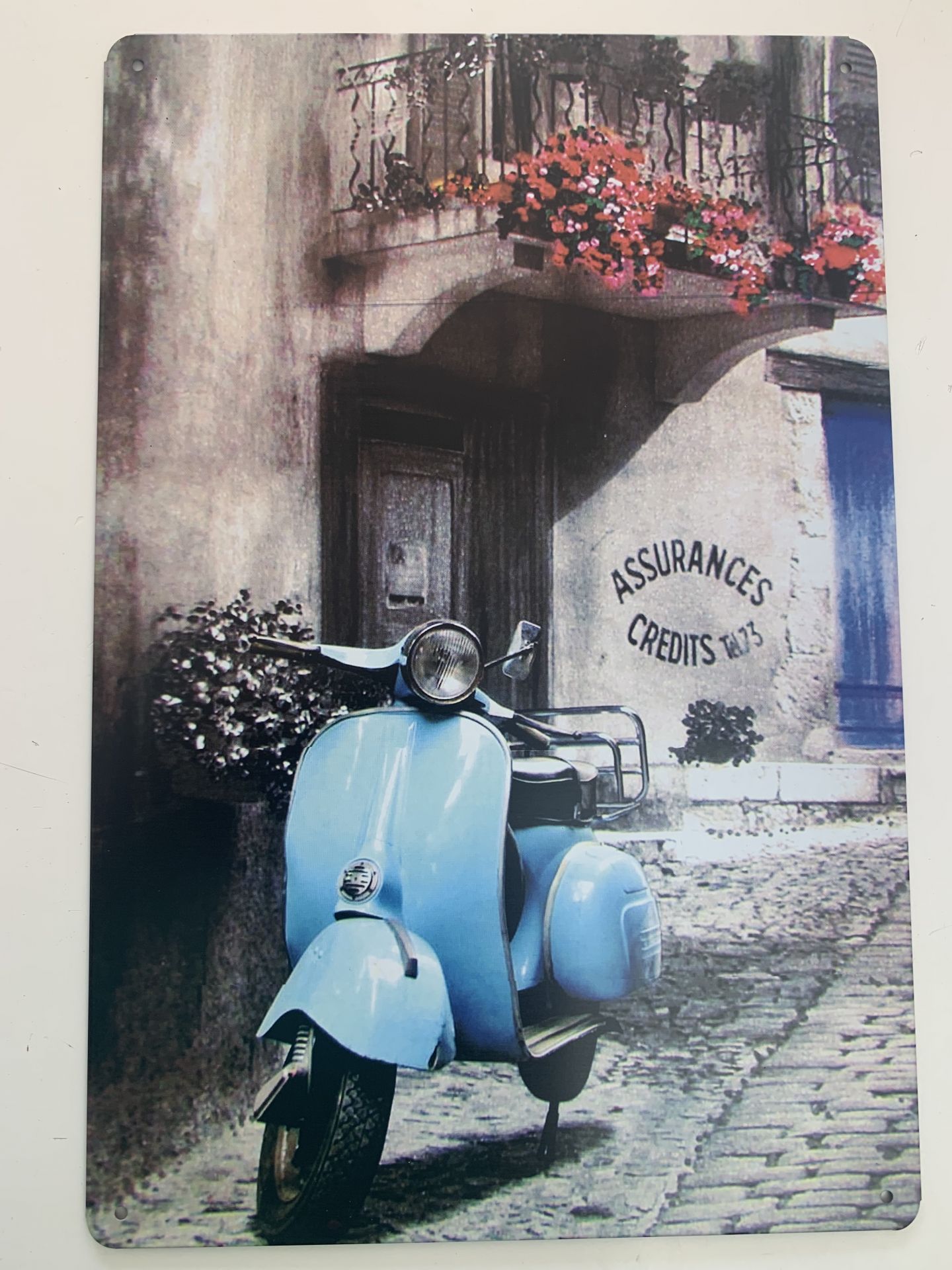 Metalen wandbord blauwe retro scooterWe hebben deze borden ook in andere varianten. Leuk om deze wandborden bij elkaar te hangen!!!Afmeting: 30 cm hoog, 20 cm breedPrijs 2,99 per stuk