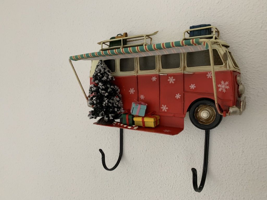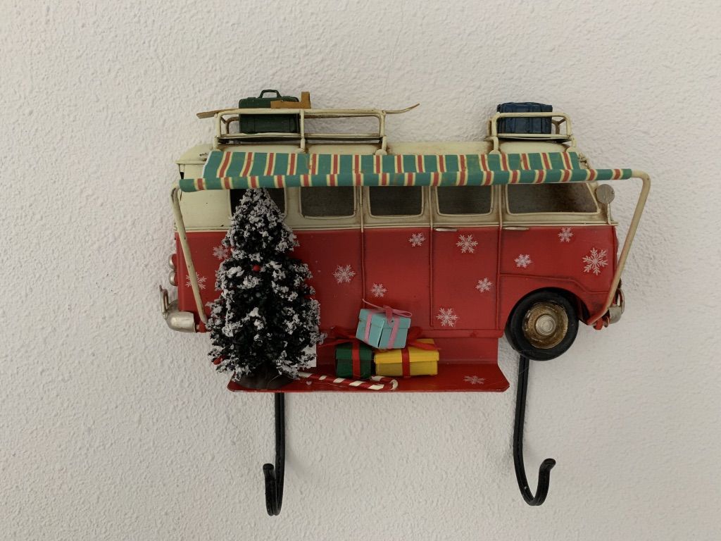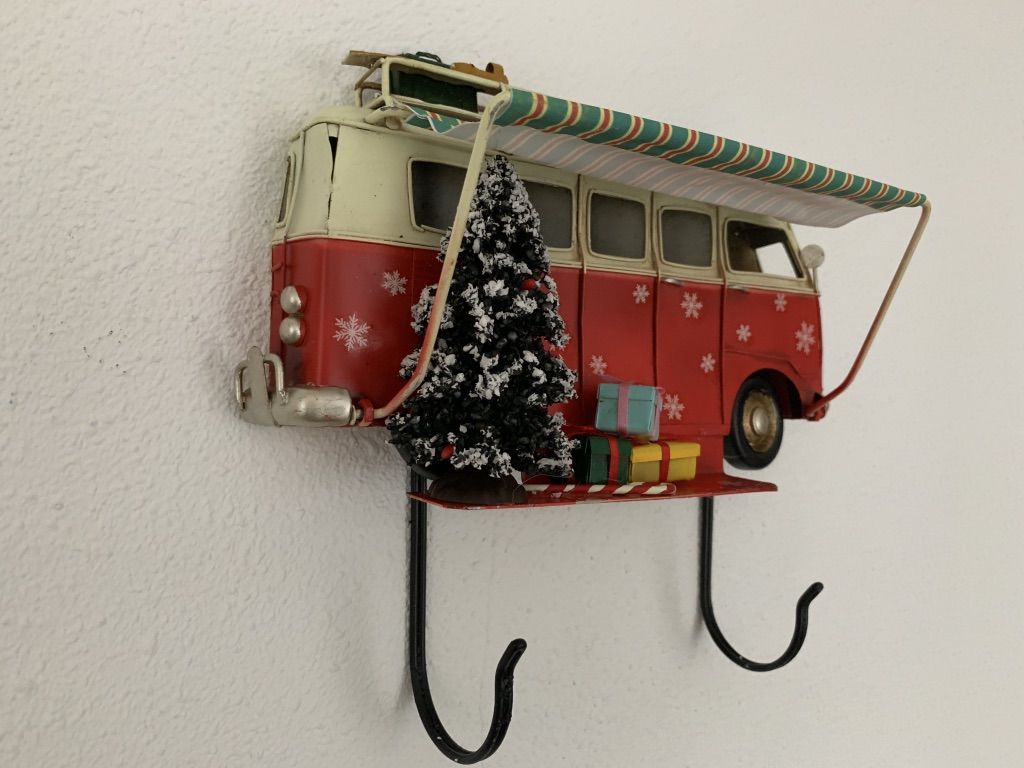 Retro Bus met luifel kerst metalen wandbord met 2 haken Rood