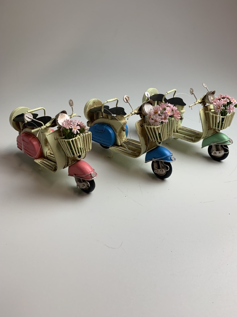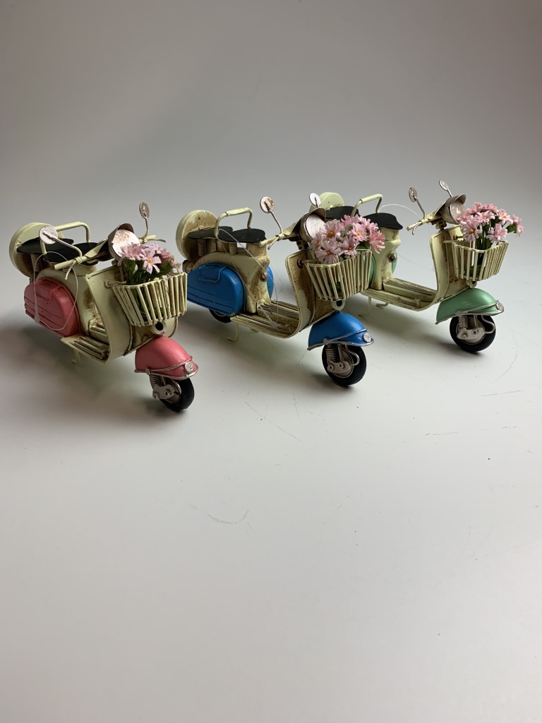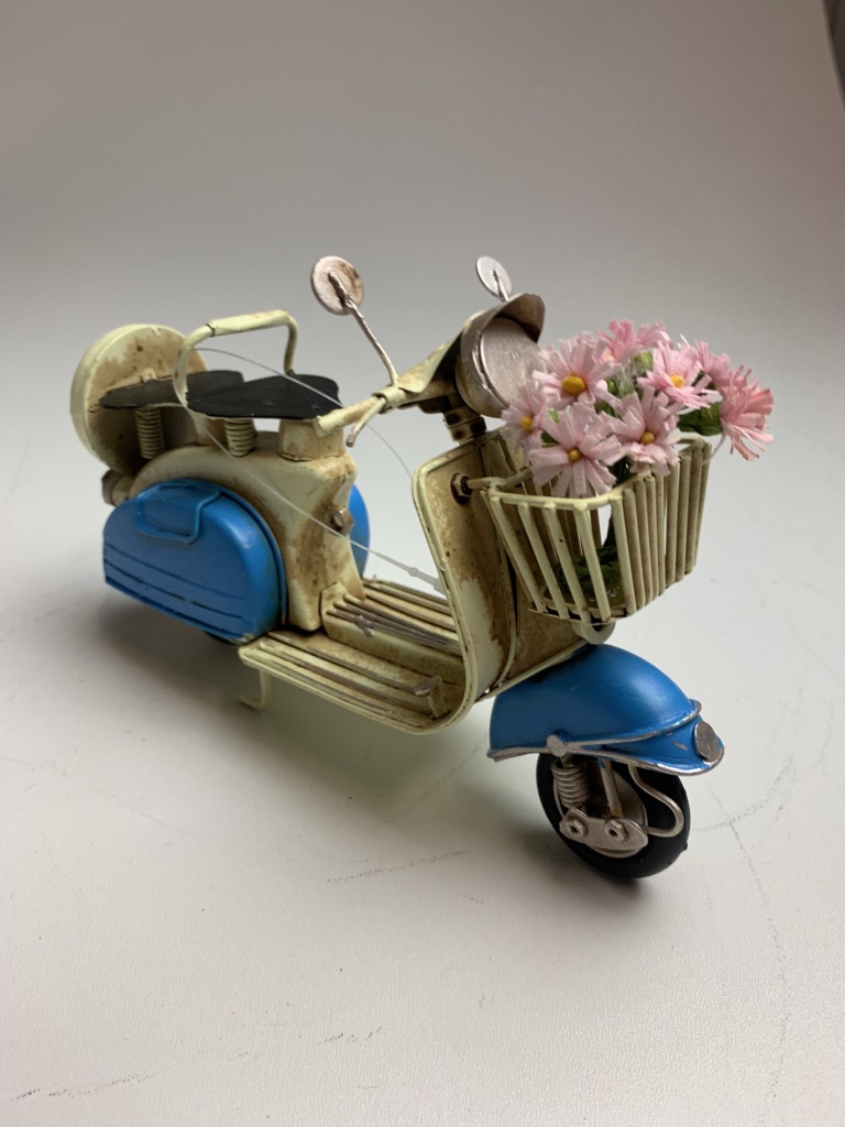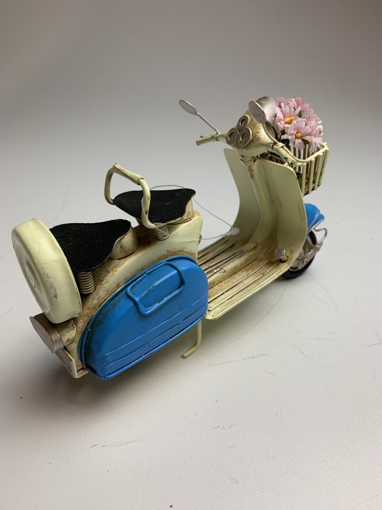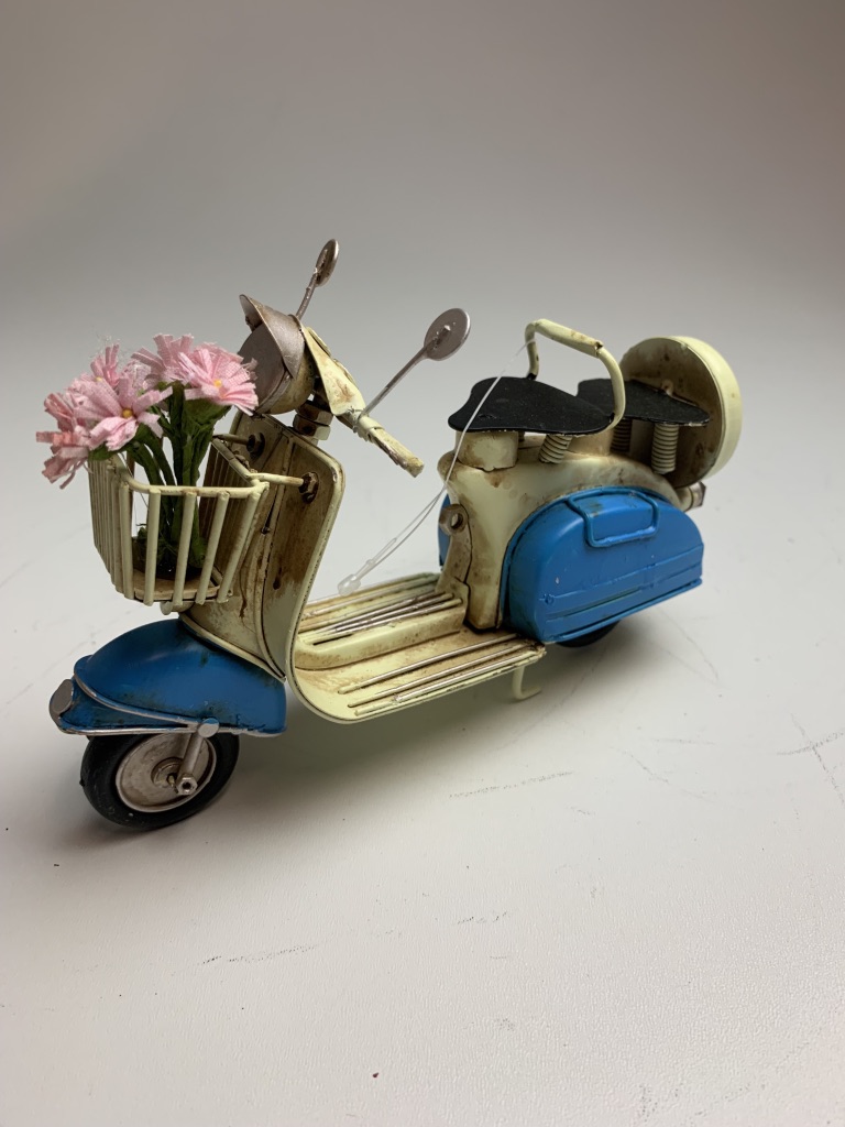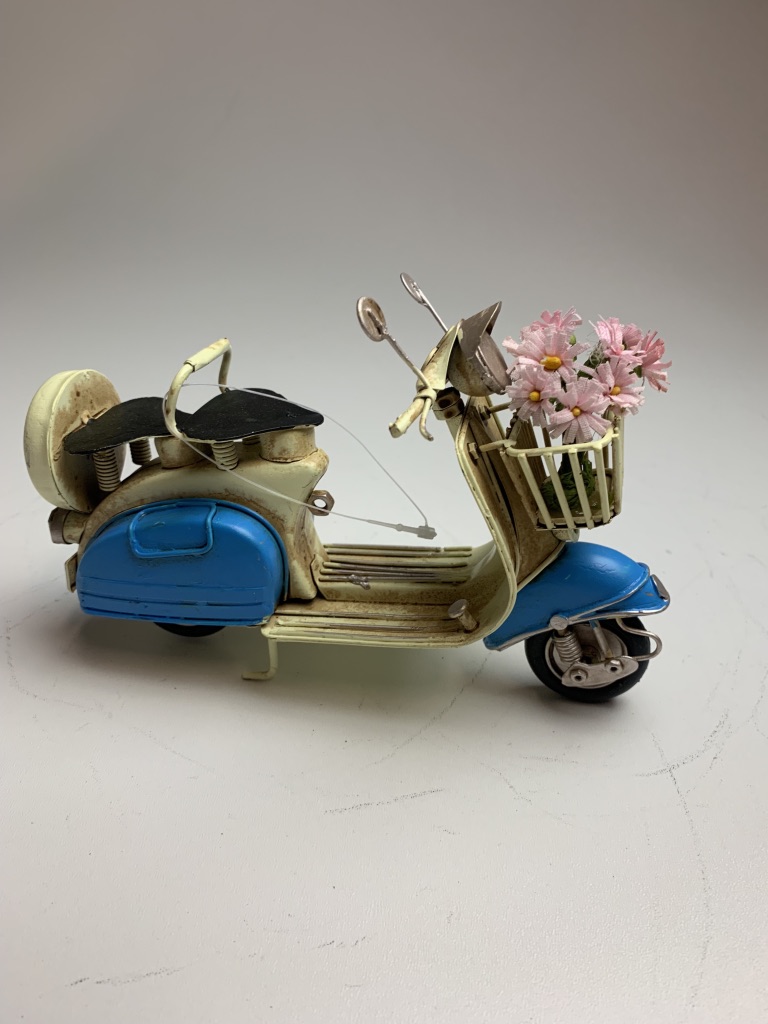 Deze retro scooter heeft een mand vol gezellige bloemen. Een leuke kadotip voor een 18-jarige dame die net haar scooterrijbewijs heeft gehaald! Maar natuurlijk mag dit unieke item, als liefhebber van retro/vintage spulletjes, ook niet ontbreken in jouw interieur.