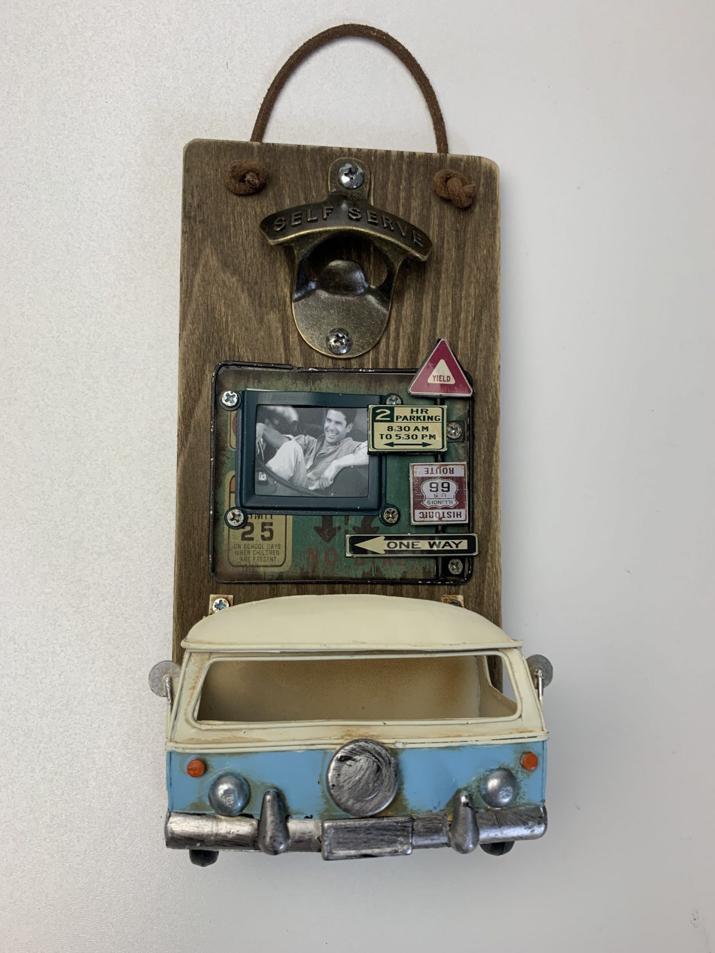 Wandbord Fles opener Retro Bus blauw met opvang bakje