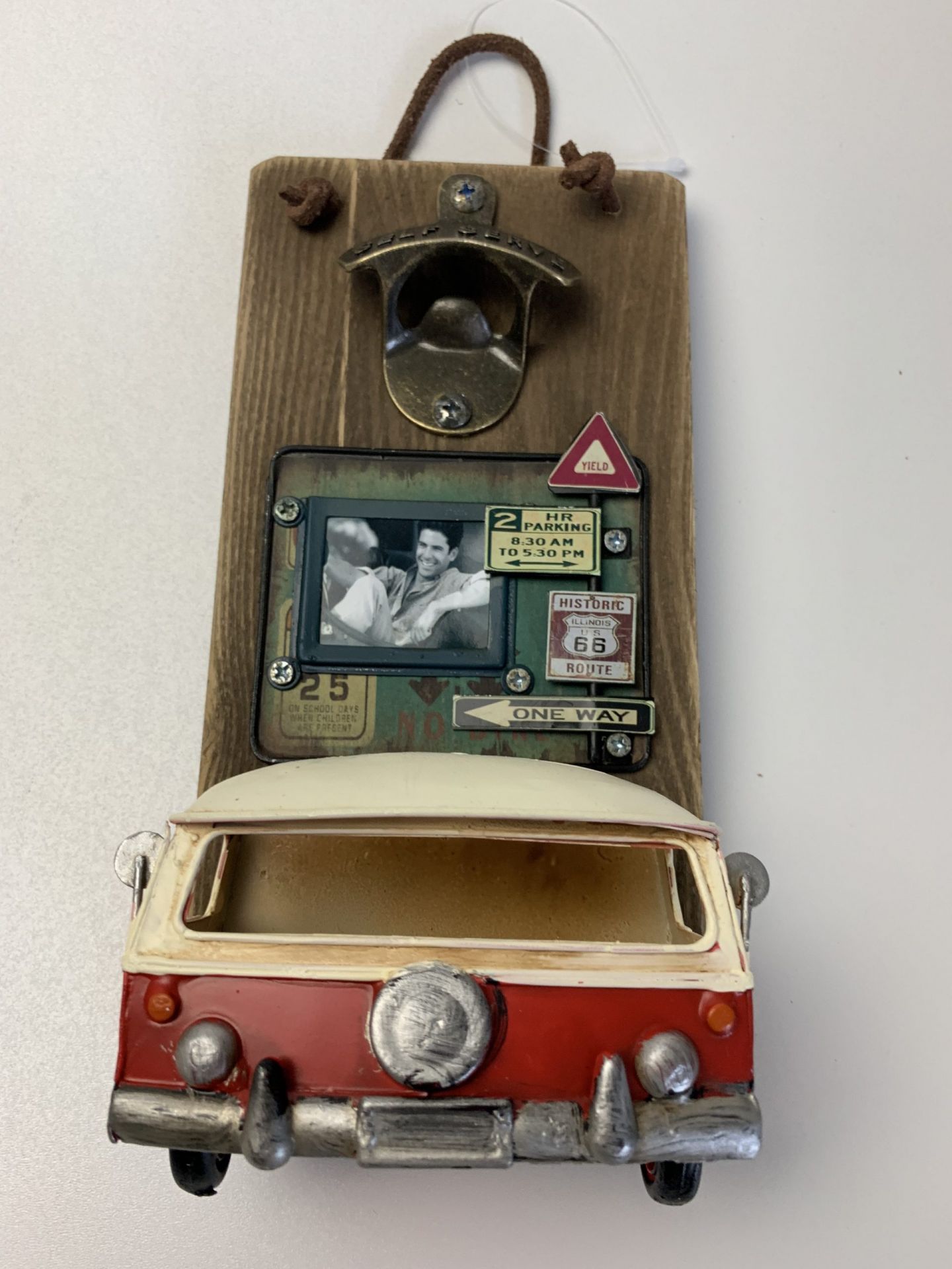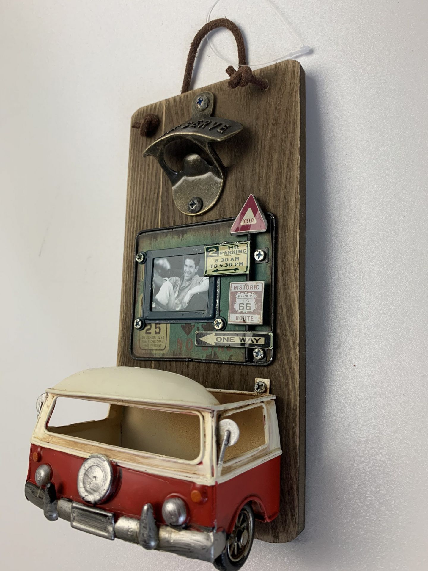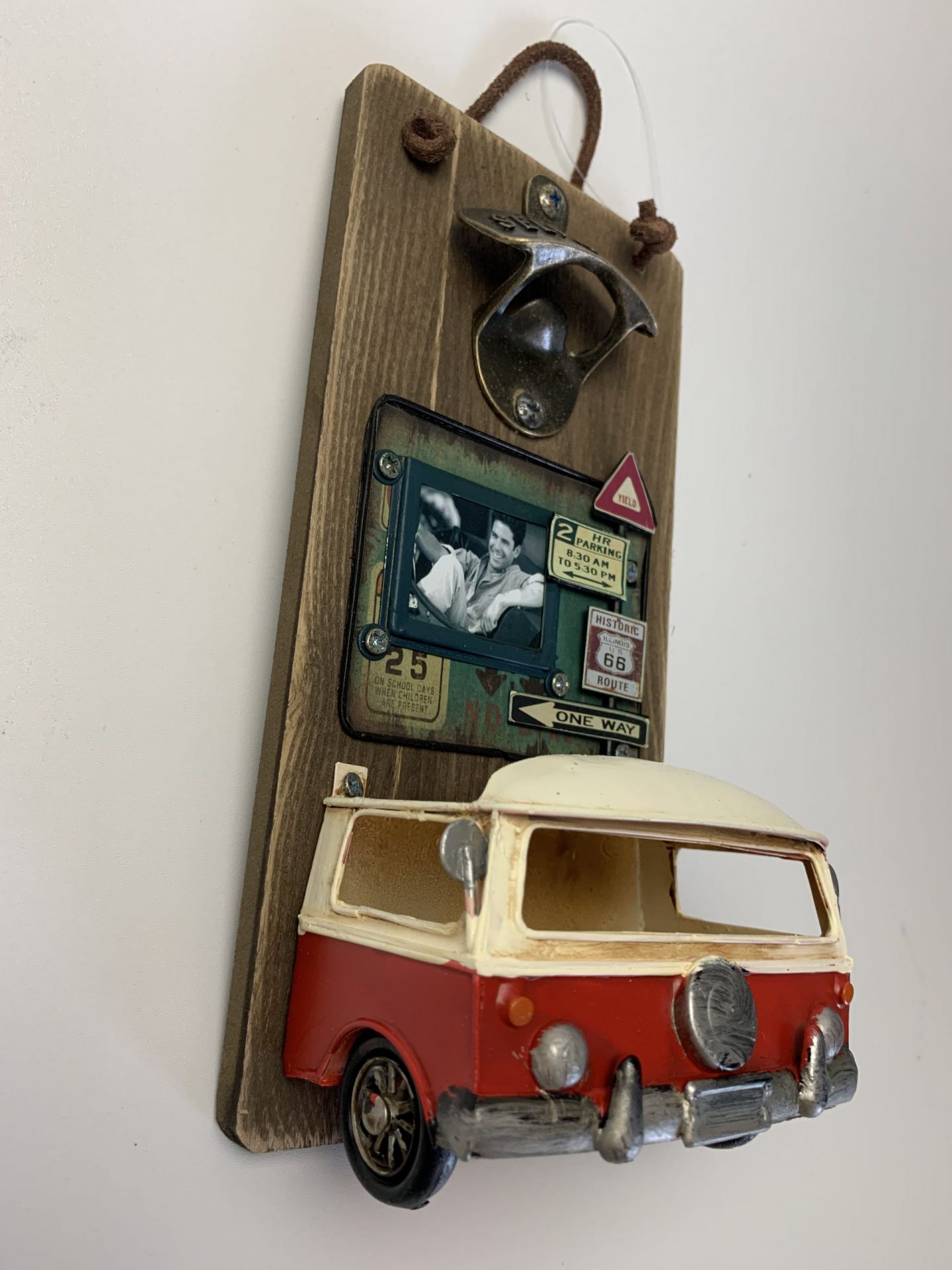 Wandbord Fles opener Retro Bus rood met opvang bakje