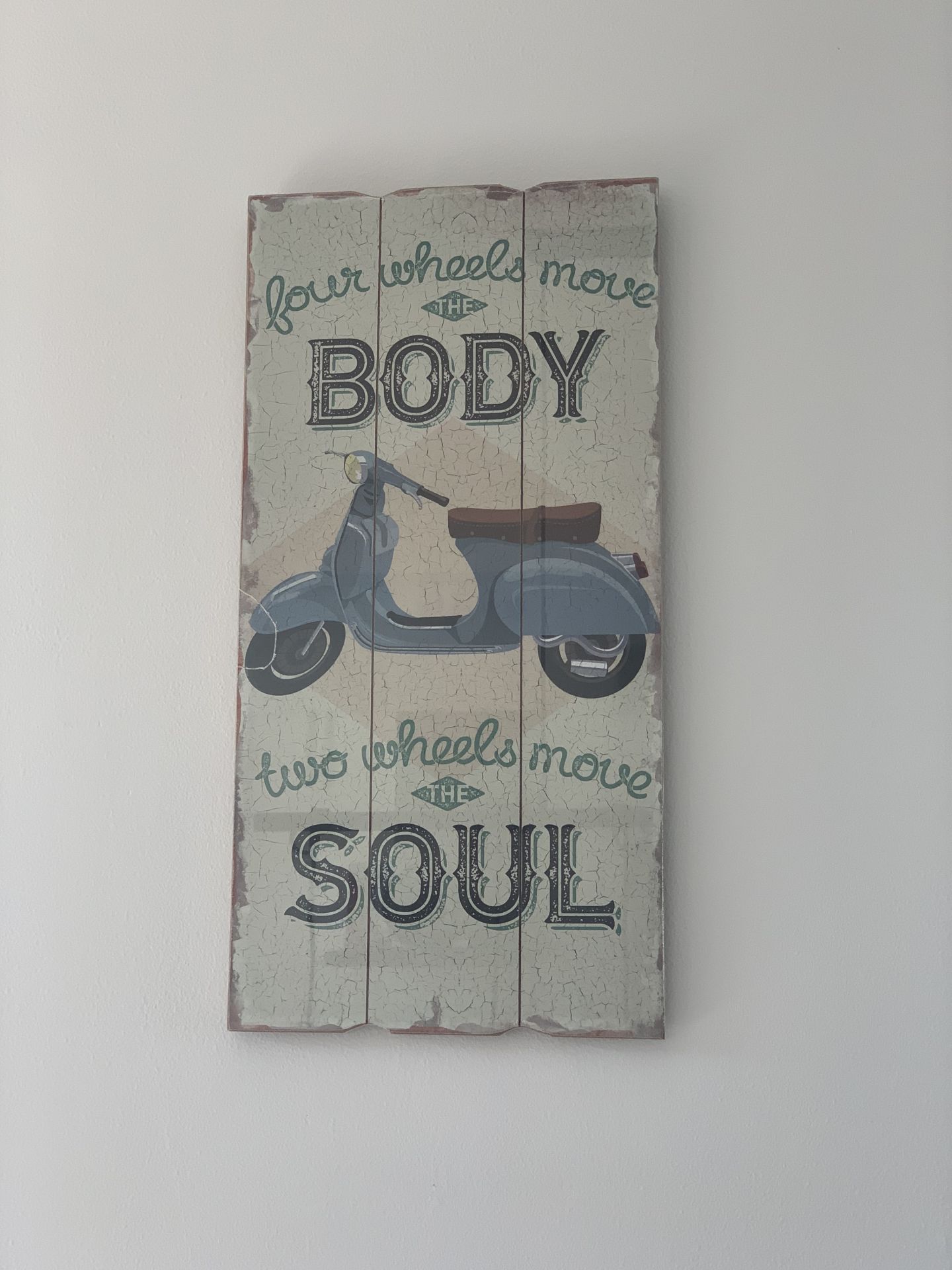 Wandbord scooter Retro ride ?”Body Soul” Groot67 cm hoog x 35 cm breedMdfDit wandbord zie je niet over het hoofd! Hij is groot en leuk! Voor die lieve zoon/dochter die het scooterrijbewijs heeft gehaald. Of gewoon zomaar leuk voor onder de veranda, woonkamer, slaapkamer. Dit bord heeft zeker de retro-look!