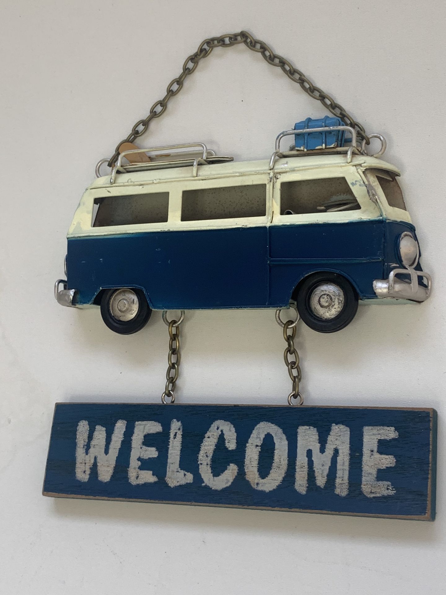 Welkom hangbordje met donkerblauwe bus